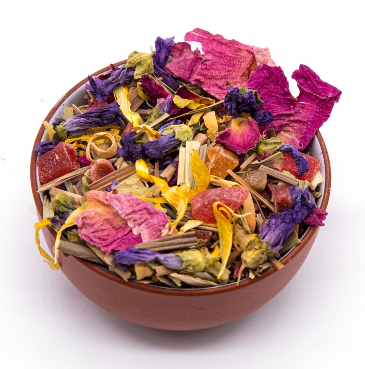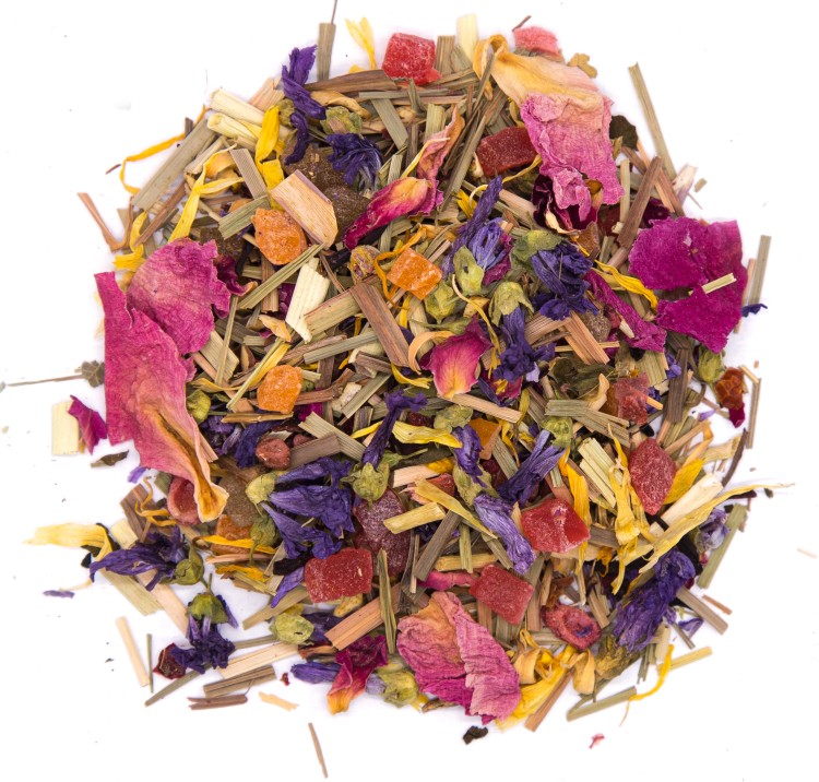 Кусочки ананаса, лемонграсса, каркаде, шиповник, цветы апельсина, цветы мальвы, кусочки малины, кусочки клюквы, лепестки календулы, листья ежевики, ягоды малины, лепестки василька, розы, пиона и аромат садовых ягод