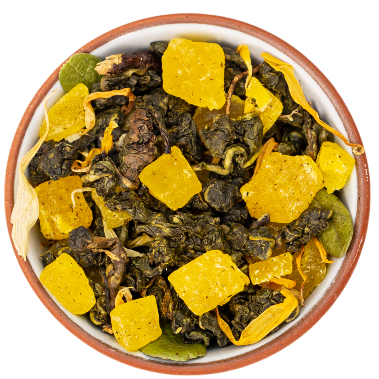 Состав Улун Те Гуань Инь, цукаты ананаса, листья брусники, лепестки календулы, ароматизатор |